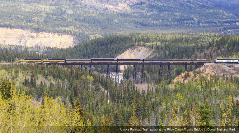 DAY 3 Alaska Railroad and Music of Denali Dinner Show: Today, board the Alaska Railroad’s flagship Denali Star for the trip to Denali National Park. The track cuts through the northern boreal forests of the interior on a journey where sparkling salmon streams, stands of aspen and birch and carpets of purple fireweed create a dramatic landscape. The train arrives just outside Denali National Park in the early afternoon. The afternoon is free of scheduled activities so you can explore the scenic surroundings on your own. Tonight, sample Alaskan cuisine at the Music of Denali Dinner Show. Then, enjoy the show for an evening of hilarious tall tales, fun songs and foot-stompin’ music. Meals: B, D