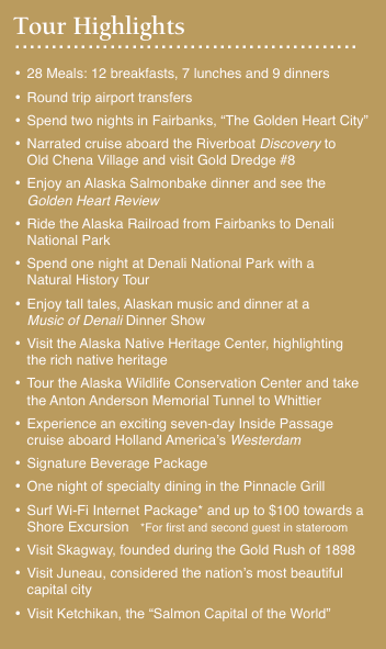DAY 6 Alaska Wildlife Conservation Center: This morning take in the dramatic views of Turnagain Arm enroute to the Alaska Wildlife Conservation Center. This haven for orphaned or injured Alaskan wildlife hosts an array of animals. Then, take the Anton Anderson Memorial Tunnel to Whittier. This 2.5 mile-long tunnel is the gateway to Prince William Sound. Later, board your ship, Holland America Line’s Nieuw Amsterdam to begin the unforgettable cruise portion of the tour. Meals: B, D